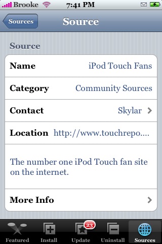 6) included the Conceited Software, Ste Packaging, ModMyiFone.com and BigBoss’s Apps and Things (BigBoss for short) sources…the update adds the iPod Touch Fans source to the Community Sources. The url for the iPod Touch Fans source is – www.touchrepo.com/repo.xml. Below are the screenshots:
