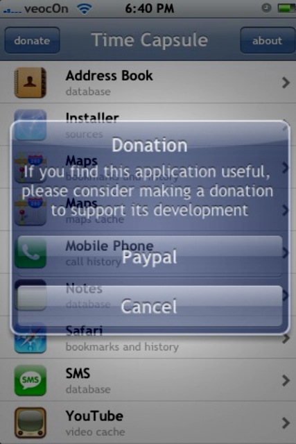 Hopefully this will eventually allow you to restore data after a restore, but only time will tell. You can find this app in Installer from the databinge source under the Utilities category. Once installed, you can find the app on your springboard. Open it and a popup will give you the option to donate, select cancel or you can move right on to the app (Do not forget to go back and donate though if you love the app!
