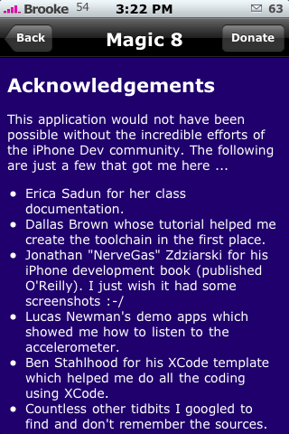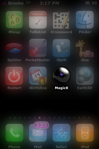 it is Magic from the iApp-a-Day marathon! In Magic, once you have gotten your message…you get the option to add your own message that gets put into the database of messages…it’s pretty cool! Anyway, tangent! However, if you would rather just shake your iPhone and get a message and don’t care about the rest…you might like Magic8 better. Magic8 is availble through the ModMyiFone.com source.