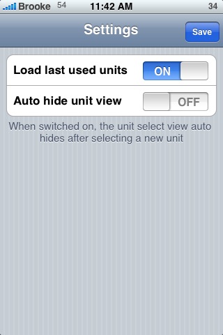 You will also notice a new Settings button in the upper left corner. It includes two settings, the ability to turn on/off Load Last Used Units and Auto Hide Unit Value. Once you get into the converting screen, there is a new feature which allows you to swap the measurements!