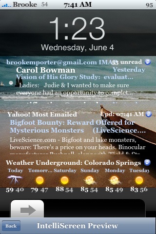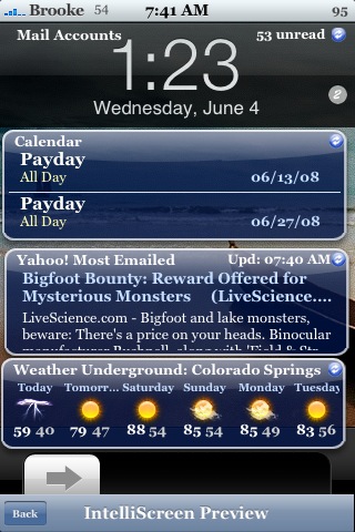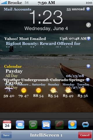 the most appealing feature to me is showing the calendar – and i have just installed iToday, which essentially gives me what i wanted and most important of all, it’s FREE! i would consider giving a small donation to a developer like Skrew. i have just erased the source for intelliscreen from the installer.