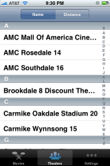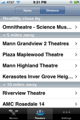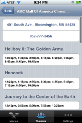 If you select the Theater option on the lower menu bar, you will get a list of all the theaters with-in the radius you chose. You can sort the list by name or distance. If you select one of the theaters on the list you are given the address of the theater (which can then be selected and will open in Google Maps), a phone number for the theater (which can also be selected which will call the number, a list of the movies that are playing in that theater and the times each of the movies are showing.