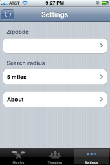 BoxOffice is an application that allows you to search for theaters and movies available in those theaters based on location. When you open the application you will get a blank screen and a lower menu bar with the options; Movies, Theaters and Setting. The first place you will want to go is into the Settings. Here you can either enter a zip code or select the locate icon in the upper left corner and the app will find your current location. You can then choose the radius in which you would like the application to search. The radius options start at 5 miles and go in increments of five up to a 50 mile radius. You can also learn more about the application by selecting the About option. Once you have entered everything into the Settings, you can then choose either the Movies or Theaters option.