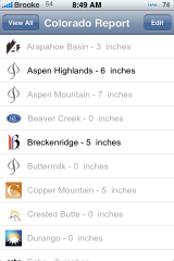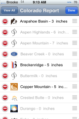 The title of this application caught my attention though, I love to ski and snowboard so I might be slightly bias! :) Colorado Snow Report is an application that displays the Colorado Snow Reports. When you first open the app you will only get information for a few resorts. However, if you select View All, you will get a much larger list. You can then select the Edit button in the upper left corner and rearrange the list or delete resorts off the list.