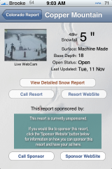 Now, the information the application gives you on the main list is the resort name and the amount of snow they have had in the past 24 hours. If you select a resort you will get a lot more information about the resort such as a live webcam, how much snow they have had in the last 48 hours, the base depth, whether the resort is open or closed, the ability to view a detailed snow report, ability to call the resort and the ability to go to the resorts website!! So very very cool! Also, when on the main list of resorts…the resorts that are darker are the ones that are open.