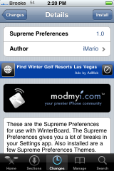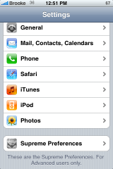 Supreme Preferences is an application that adds additional functionality to your Settings options (similar to Extended Preferences). When you install Supreme Preferences, you will need to go into WinterBoard and select it in order to activate it. Once, you have selected it in WinterBoard, you can go into your stock Settings application (which will now have a new icon).