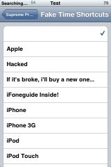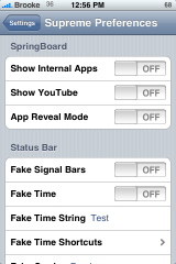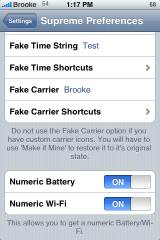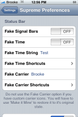 The next set of options are the Status Bar settings. Here you can turn on/off Fake Signal Bars (for iPod Touch users), Fake Time which allows you to change the time to what ever you enter into the Fake Time String section or, you can choose from a few prefabbed phrases using the Fake Time Shortcuts option. You can also change your Carrier using the Fake Carrier option. You can choose from a from a few prefabbed phrases (the same ones as the Fake Time) using the Fake Carrier Shortcuts option. The Fake Time setting worked great for me. The Fake Carrier option worked as well however, if you already have a fake carrier set using any other application (MakeItMine), when you delete it using Supreme Preferences, it does not put your stock carrier logo back. Which for me isn’t really a big deal…I just entered Brooke back in and it changed it with no problem.