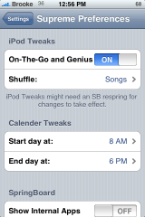 The rest of the settings are located in the Supreme Preferences options. When selected, you will get a page that includes all the addition settings that Supreme Preferences offers. The first is On-The-Go and Genius for your iPod. You can also choose if you would like it to shuffle by Songs or by Albums. The next options are Calendar Tweaks. Here you are able to choose what time you would like your calendar to start and end the day. Though, I’m not really sure I ever got this feature to work…even after restarting my iPhone. It was the same for the next set of features as well, SpringBoard. The Show Internal Apps, Show YouTube and App Reveal Mode did not seem to work for me no matter what I tried. You will have to let me know in the comments if they worked for you.